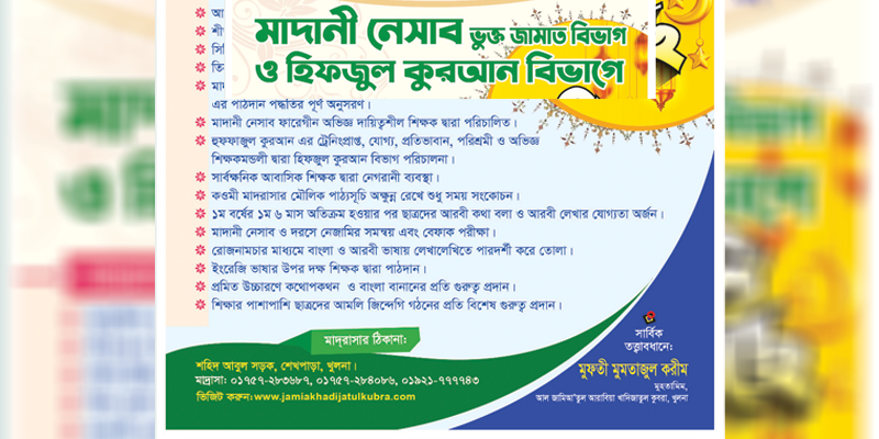 তাই নারী জাতির এহেন দুরবস্থাকে বিবেচনাপূর্বক আল্লাহ (জা. শা.)-এর অশেষ রহমের বদৌলতে উন্নত পর্দানশীল পরিবেশে সুষ্ঠু ও সুন্দর থাকা-খাওয়ার ব্যবস্থাপনায় দ্বীনি শিক্ষার সাথে সাথে উত্তম চরিত্র এবং সাধারণ শিক্ষায় (বাংলা, অংক ও ইংরেজী প্রভৃতি) শিক্ষিত করে আদর্শবান নারী গড়ার মানসে সুন্নাত ও তাক্বওয়ার প্রশিক্ষণ দিয়ে গ্রহণযোগ্যতার দৃঢ় প্রত্যয়ে মহিলাদের জন্য একটি আদর্শ দ্বীনি শিক্ষা প্রতিষ্ঠান স্থাপিত হয়েছে। অতএব, আসুন! আপনার মেয়ে বা বোনকে গড়ে তুলুন একজন মুসলিম ও দ্বীনদার মহিলারূপে।